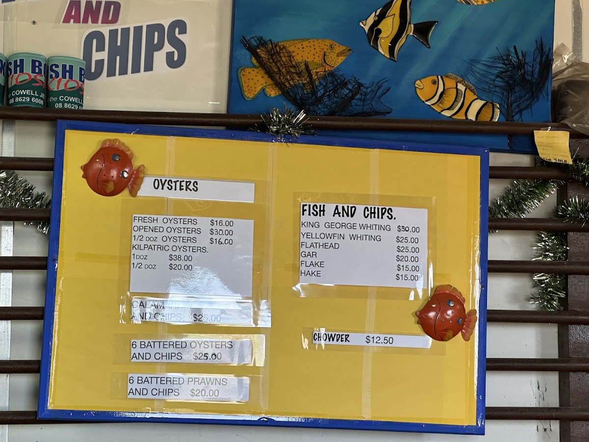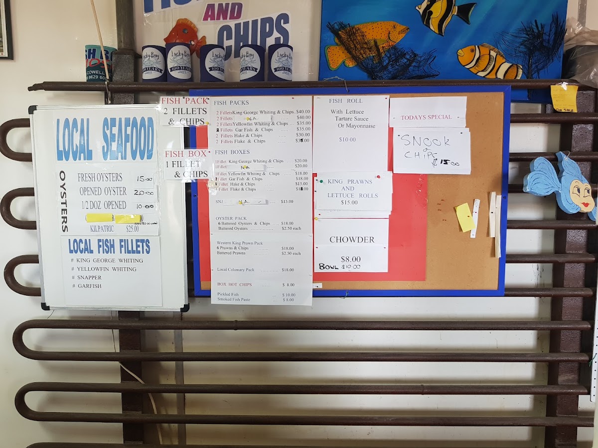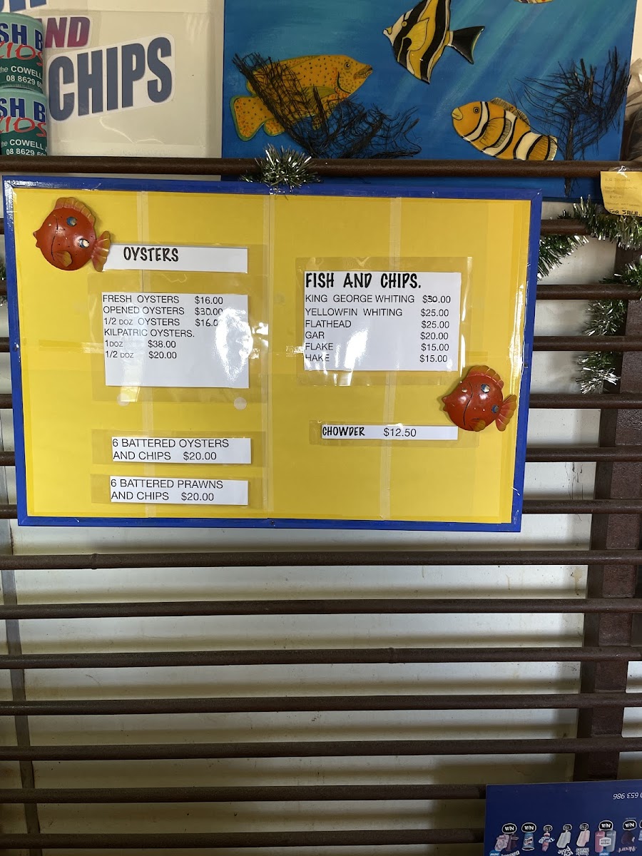 The menu at The Fish Box Kiosk in Cowell offers a delightful variety of seafood options, perfect for lovers of fresh, local catches. Their Fish and Chips selections include King George Whiting, Yellowfin Whiting, Flathead Gar, and Flake, each promising a crispy, satisfying meal. For oyster enthusiasts, the restaurant provides several oyster options such as Fresh Oysters, Opened Oysters, and the indulgent 1/2 Doz Oysters Kilpatrick. They also offer 6 Battered Oysters and Chips or 6 Battered Prawns and Chips for a complete, hearty meal. A standout on the menu is the Mullaway and Chips in the Today's Special section, offering a unique taste of the day's catch. For those craving more variety, there are Western King Prawn Packs and Local Calamary Packs, both perfect for sharing or a solo treat. The menu also features comforting sides like Box Hot Chips, as well as more distinctive options such as Pickled Fish and Smoked Fish Paste, providing something for everyone. Each dish combines freshness with a flavorful touch, making The Fish Box Kiosk a must-visit for seafood lovers in the area.